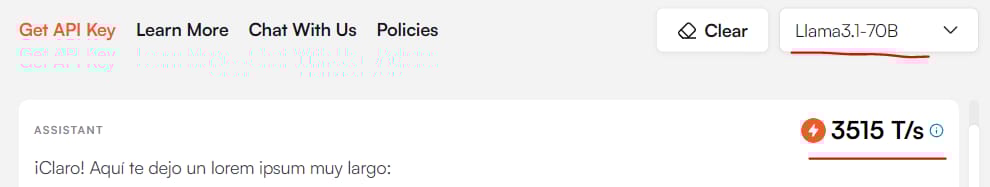 Con el modelo Llama3.1-70B alcanza más de 2.100 tokens por segundo (unas 1.575 palabras por segundo).